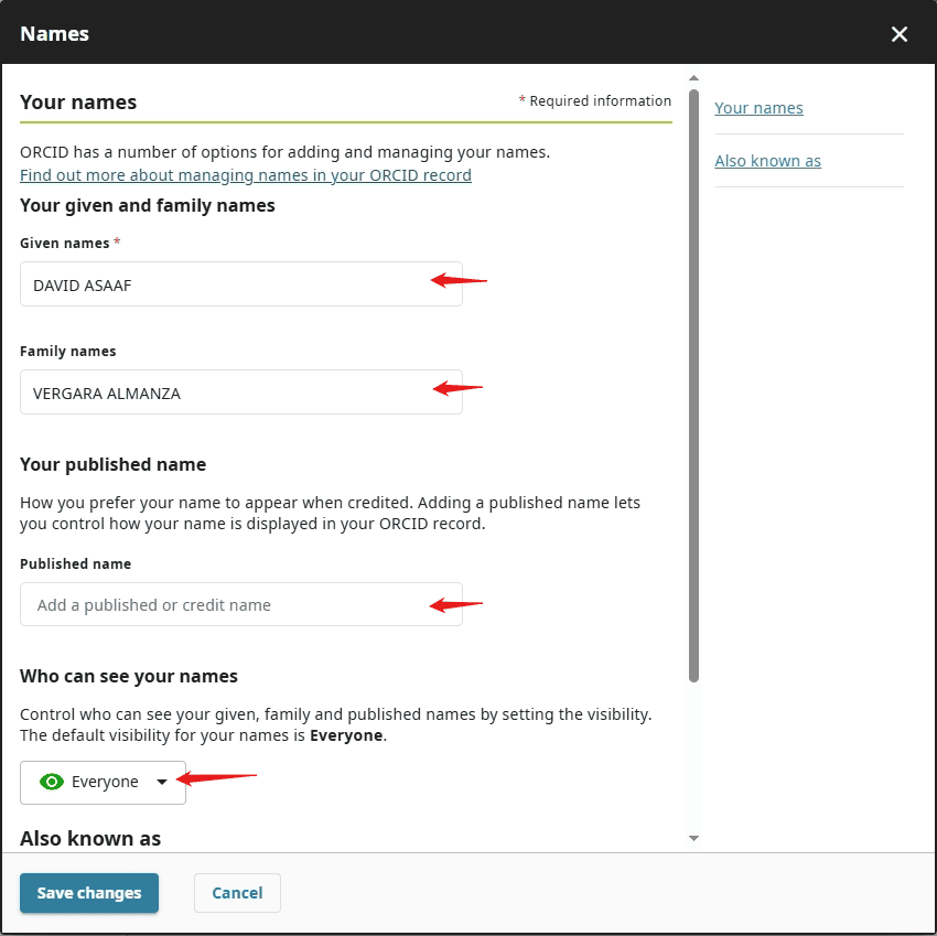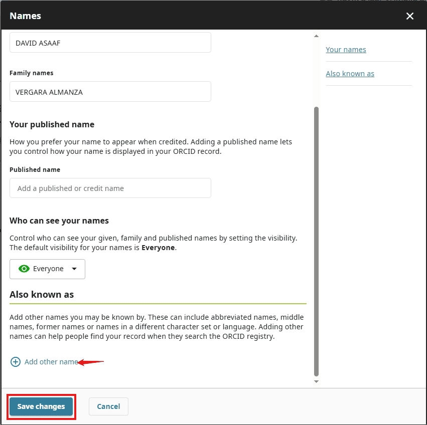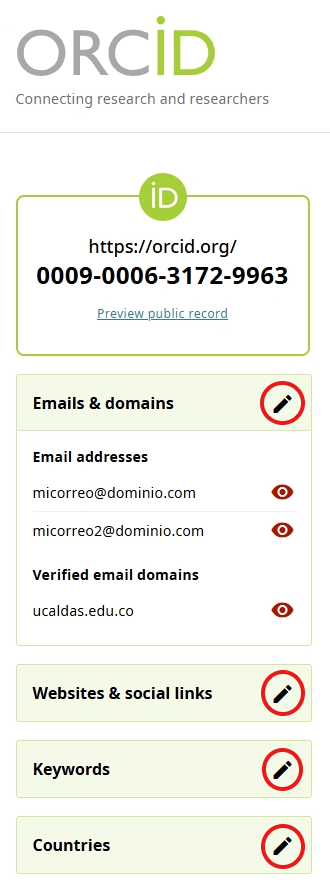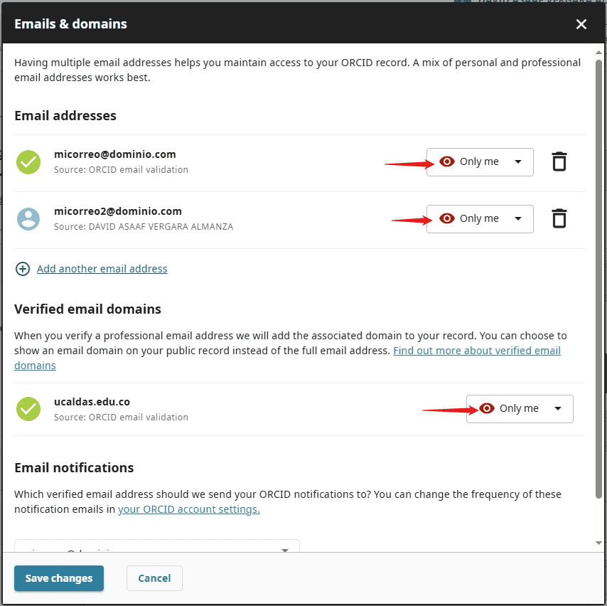Correo electrónico: Cuenta asociada al perfil, este puede ser personal, institucional incluso ambos, se recomienda hacer uso del correo institucional para la vinculación con el orcid institucional. En esta opción podemos modificar el correo, agregar otra cuenta, dar visibilidad o borrarlas de considerarse así.