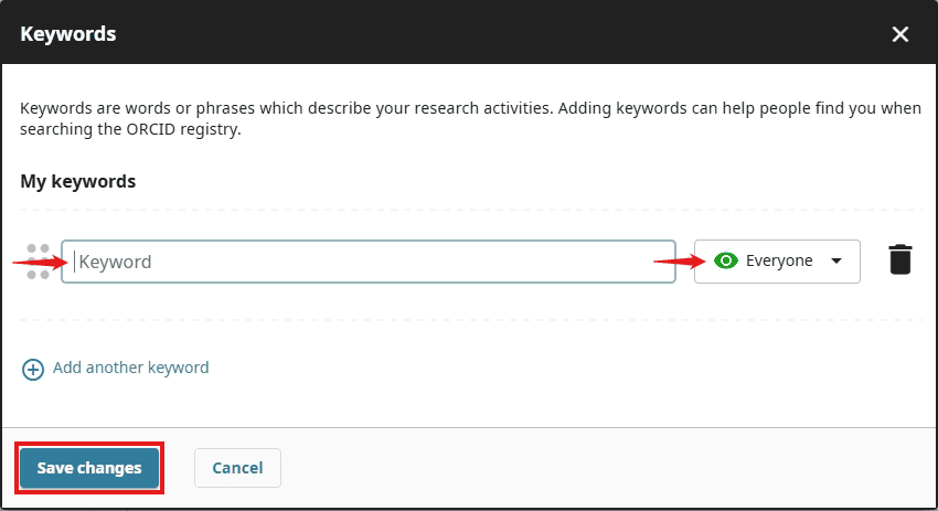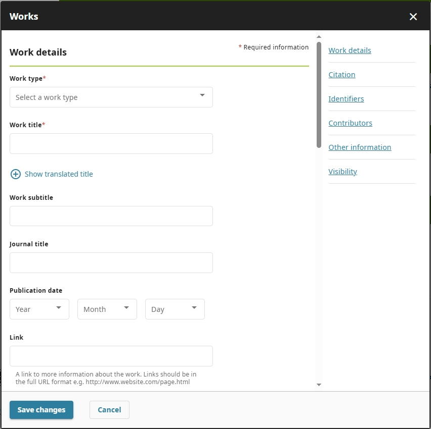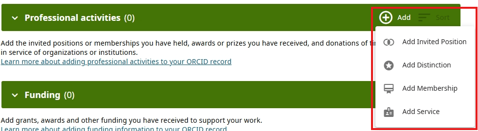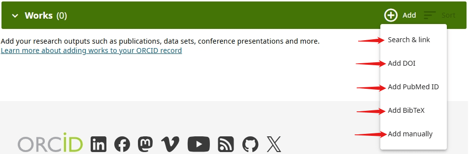 Añadir BibTex: Con la herramienta de importación BibTeX, puede importar sus trabajos de investigación desde sistemas que aún no han creado una conexión con ORCID. Probamos nuestra herramienta de importación con BibTeX generado a partir de proveedores estándar de BibTeX.