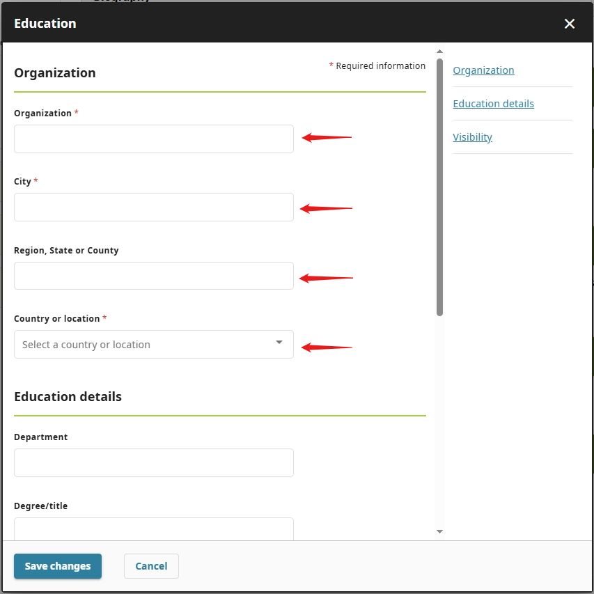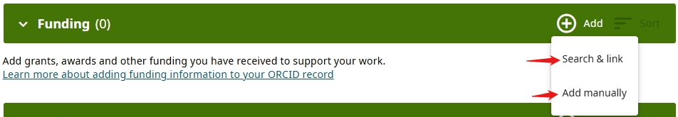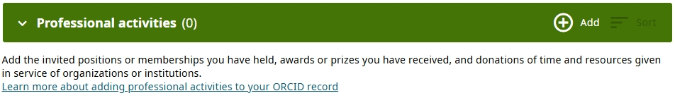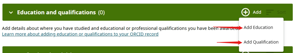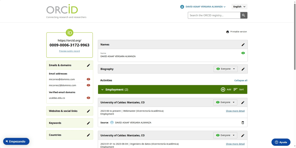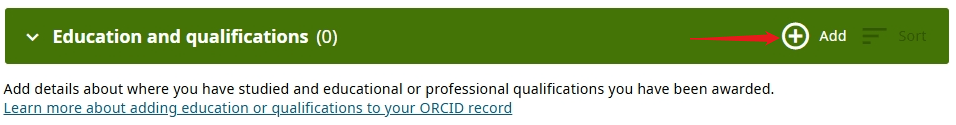 Para agregar una nueva afiliación inicie sesión en su registro ORCID, desplácese hasta la sección a la cual desea agregar información de forma manual.