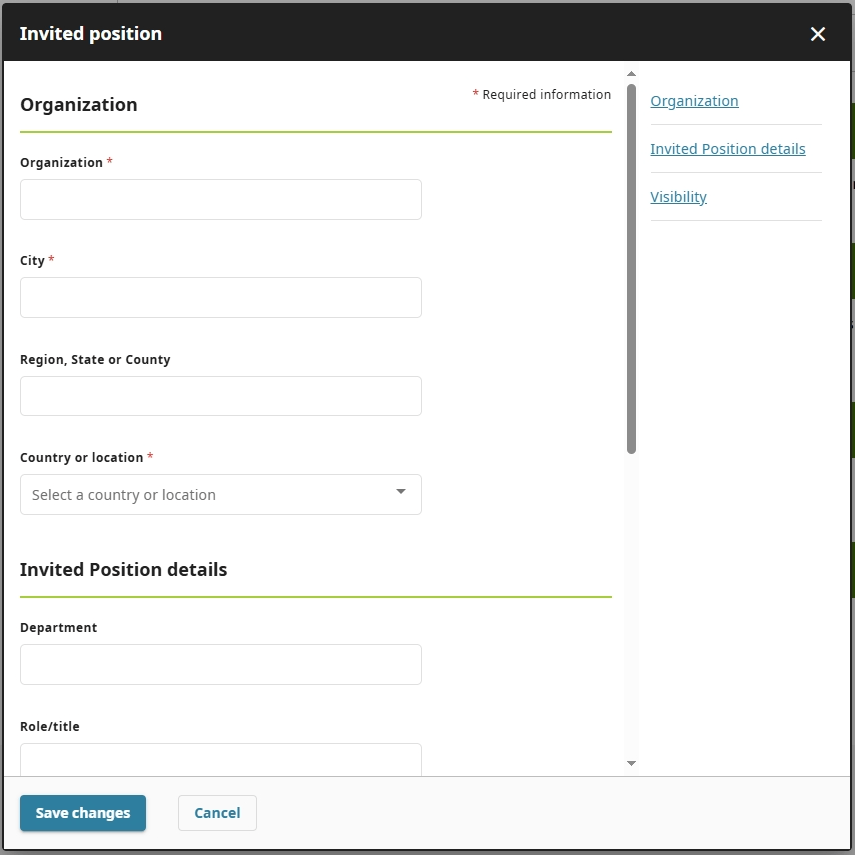 Añadir posición invitado: Se usa para una afiliación no laboral por invitación. Estos incluyen el reconocimiento formal de su esfuerzo académico a través de títulos honorarios y/o puestos por invitación que no requieren un servicio especial. Pueden ser remunerados o no, y usted puede o no estar basado en una organización diferente.
