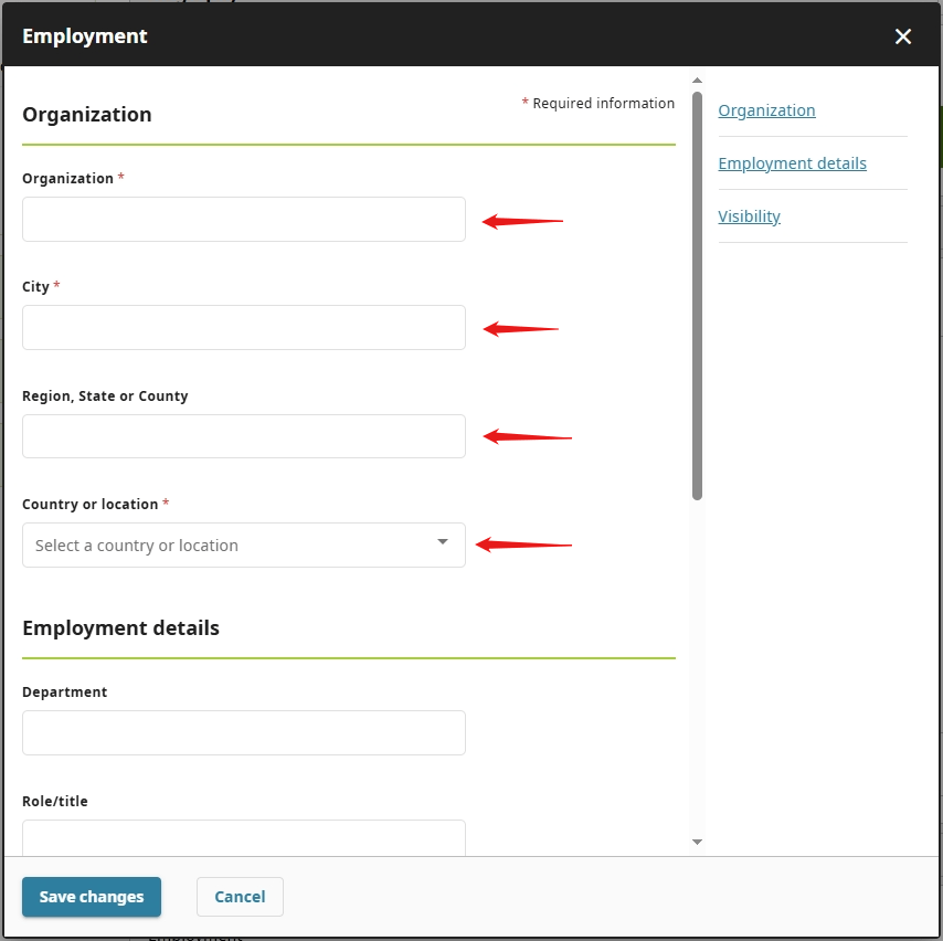 Es un tipo de afiliación en el registro ORCID que describe la relación laboral formal entre una persona y una organización. Los campos que contengan un * son completamente obligatorios.